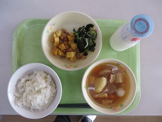 ごはん さつまいもと大豆のごまがらめ しらすあえ みそ汁 牛乳