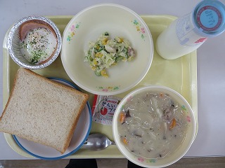 胚芽パン きのこシチュー カップエッグ ビーンズサラダ 牛乳