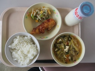 ごはん 魚の甘辛 柿サラダ キムチスープ 牛乳