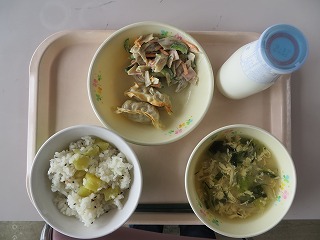 さつまいもご飯 ぎょうざ ごぼうサラダ みそ汁 牛乳