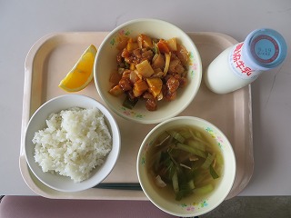 ごはん 酢豚 中華スープ オレンジ 牛乳