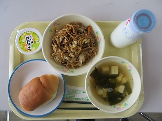 バターロール 焼きそば わかめスープ 梨ゼリー 牛乳