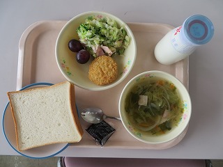 食パン メンチカツ サラダ 巨峰 コンソメスープ ジャム 牛乳