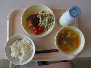 2015年9月29日 13時55分ごはん チキンカツ ごぼうサラダ ミニトマト さつま汁 牛乳