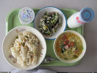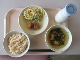 キムタクご飯 イカボールの甘煮 スパゲティサラダ すまし汁 牛乳