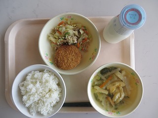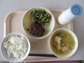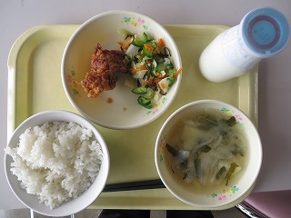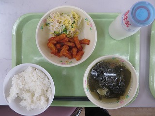 ごはん 手作り薩摩揚げ いそべあえ 鶏団子汁 牛乳