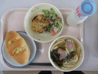チーズクッペ ひやしわかめうどん トマトサラダ 野菜かき揚げ 牛乳