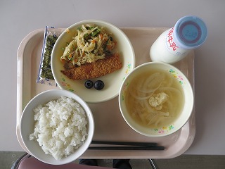ごはん トビウオのフライ 切り干し大根煮 ブルーベリー みそ汁 焼き海苔 牛乳