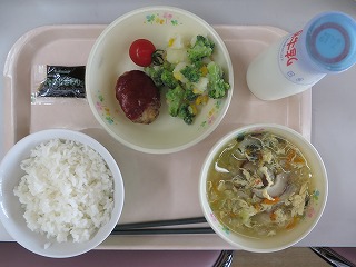ごはん ハンバーグ そえ野菜 ミニトマト コンソメスープ ひじきのり 牛乳