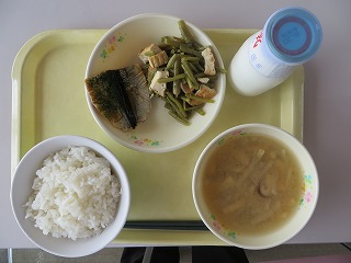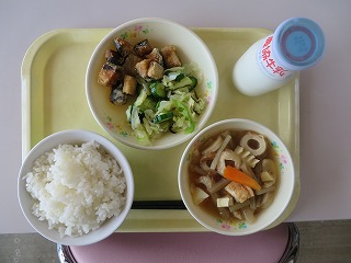 ごはん 魚の蒲焼き風 かたはの煮物 みそ汁 牛乳