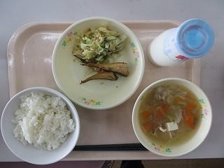 ごはん はたはたの唐揚げ 梅和え 豚汁 牛乳