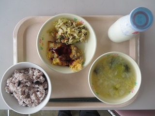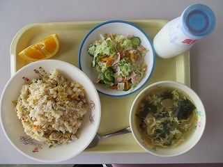 かたはご飯 中華スープ サラダ オレンジ 牛乳