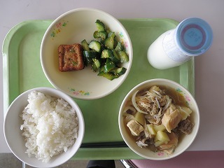 ごはん ひじきと豆腐の豆腐寄せ すきやき風煮 きゅうりあえ 牛乳