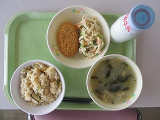 そぼろ丼 コロッケ 切り干し大根のサラダ みそ汁 牛乳