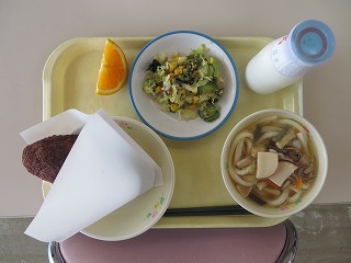 ココアパン 山菜うどん シーチキンサラダ オレンジ 牛乳