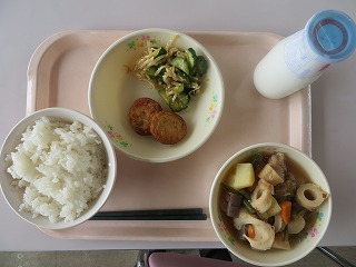 ごはん 五色揚げ 野菜のピリ辛和え いりどり 牛乳