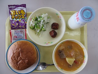 胚芽パン ボルシチ風 ミートボール サラダ ジャム 紫芋チップス