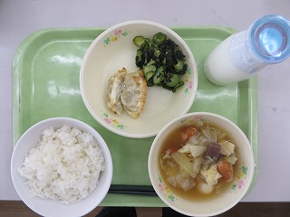 ごはん ぎょうざ わかめの酢の物 洋風おでん 牛乳