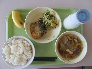 ごはん さばのカレー揚げ おひたし のっぺい汁 バナナ 牛乳