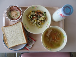 ミルク食パン カップエッグ ウインナーソテー コンソメスープ ジャム 牛乳