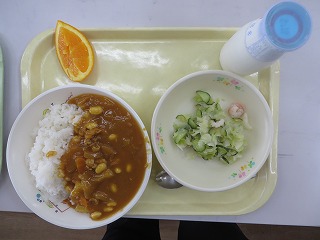 大豆入りカレーライス サラダ オレンジ 牛乳