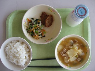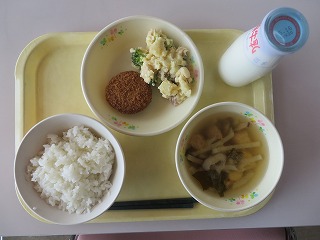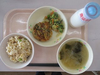竹の子ごはん みそ汁 野菜かきあげ ごまあえ 牛乳