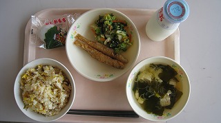 ごはん メギスとごぼうのちぎり揚げ おひたし いり豆腐 牛乳