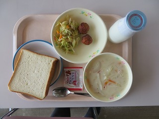ミルク食パン クラムチャウダー ミートボール煮 野菜ソテー ジャム 牛乳