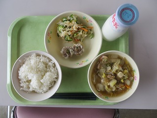 ごはん シューマイ 切り干し大根のサラダ とりすき 牛乳