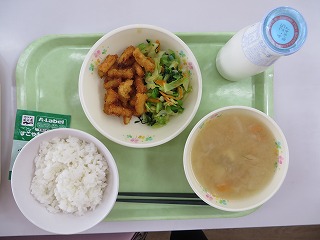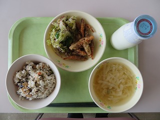 ひじきご飯 ガスエビの唐揚げ ゆかりあえ みそ汁 牛乳