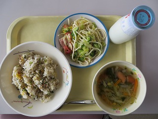 小松菜と挽肉のチャーハン コンソメスープ スパゲティサラダ 牛乳