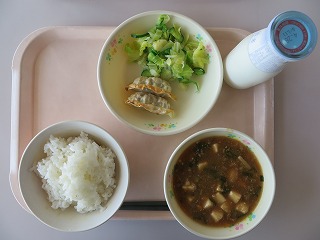 ごはん ぎょうざ 浅漬け 麻婆豆腐 牛乳
