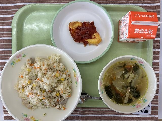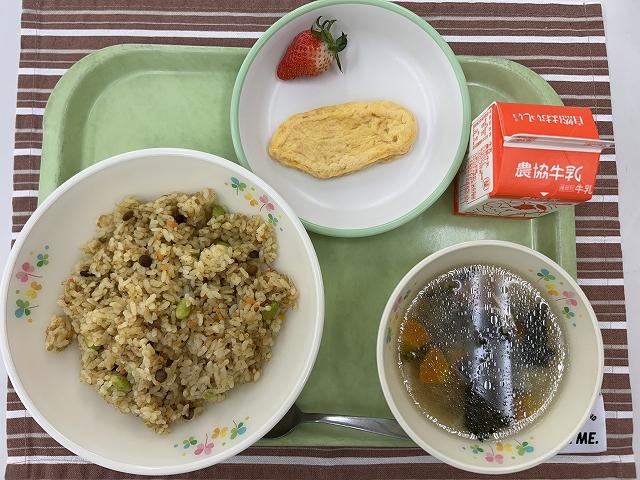 今年度最後の給食は、「カレーピラフ」です。釜で炒めた具をコンソメを入れて炊いたごはんに混ぜ込みます。カレーピラフには、レンズ豆が入っています。食べ慣れない食品に、「先生これ何?」という質問が多かったです。