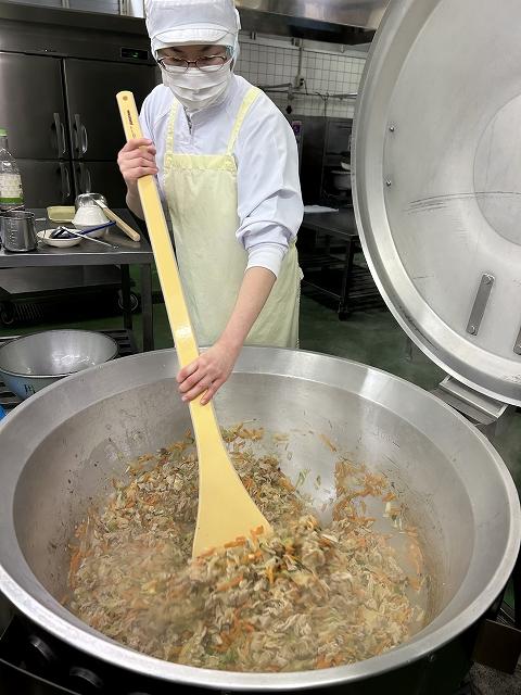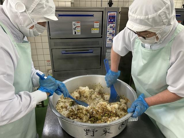 今日の給食は、今年度初めての混ぜごはんです。穴水町は調理場で炊飯しています。混ぜごはんのときは、和風ならしょうゆや昆布、洋風ならコンソメを入れて炊飯します。今日は、洋風の混ぜごはんなので、コンソメが入っています。別の釜で、具を作り炊けたごはんに混ぜ込んで作ります。混ぜた時の味を考えながら、少し濃いめ具を作るのがポイントです。