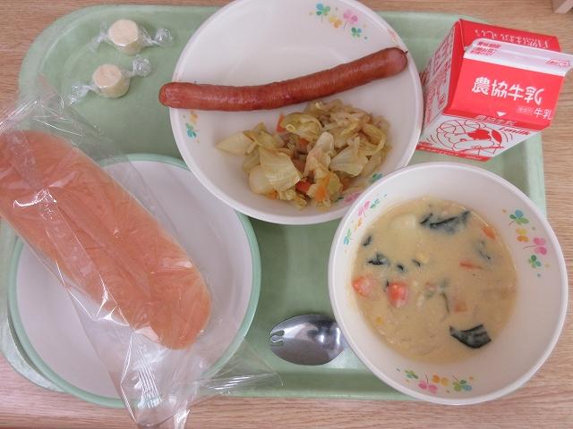 初日の今日は、食べやすいように背ふるドックパンでした。入学式がランチルームで行われたため、給食は家庭室でみんなで食べました。明日からは1年生の給食も始まり、通常通りランチルームで食べます。