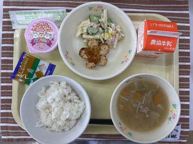 今日は入学・進学をお祝いしたメニューでした。かわいいお花の形をしたとうふハンバーグには、甘辛いタレをかけて食べやすくしています。マカロニサラダは、りぼん型のマカロニ入りで彩りよく春らしいサラダに仕上がりました。