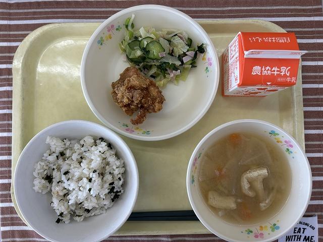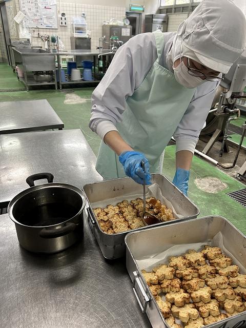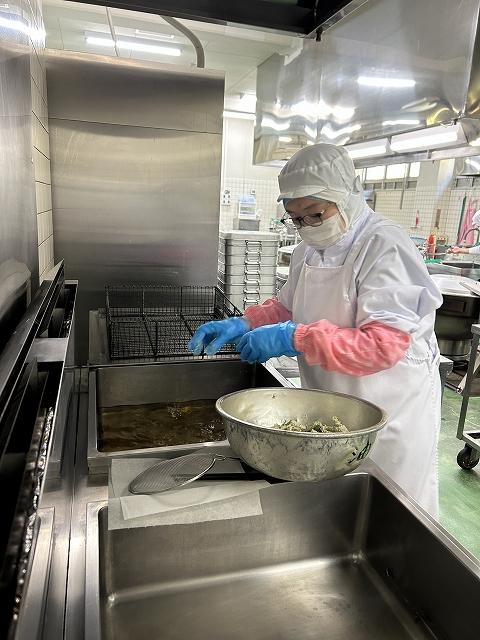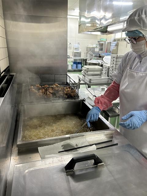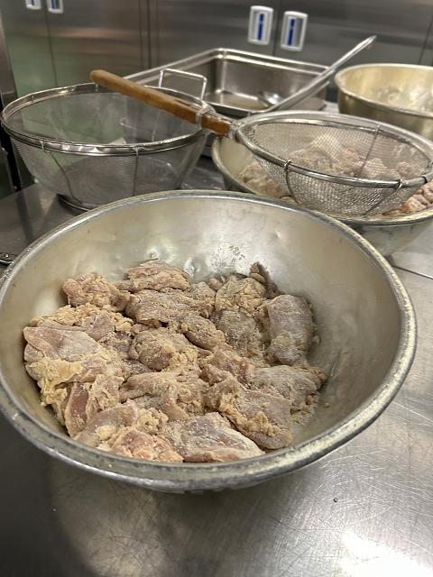 今日の主菜は、「鶏肉のから揚げ」です。鶏肉にしょうが、しょうゆ、さけで下味をつけ、片栗粉と米粉の衣をつけて揚げます。特別なことはしていませんが、調理員さんの愛情がこもった給食の人気メニューです。