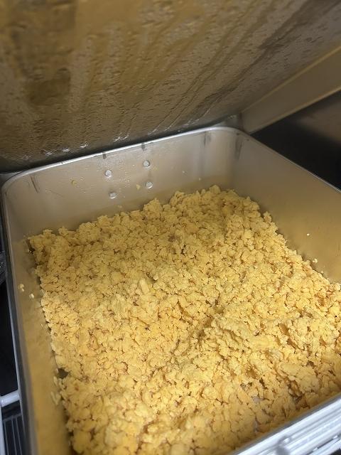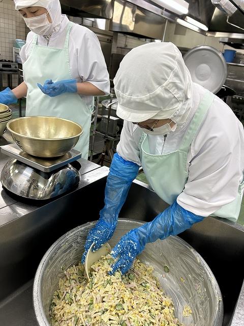 サラダには、調理員さんの手作りの炒り卵が入っています。きれいな黄色に仕上がり、春らしい彩りのサラダになりました。