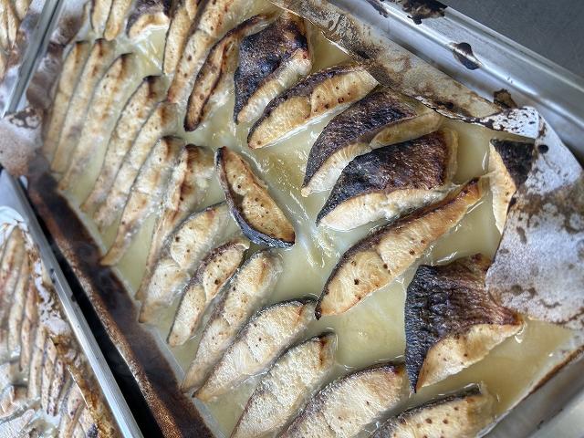 今日の主菜は、「さけの白こうじ焼き」です。石川県で作られた白こうじにさけを漬け込み、オーブンで焼きました。こうじの働きで、さけがしっとりやわらかく焼きあがります。