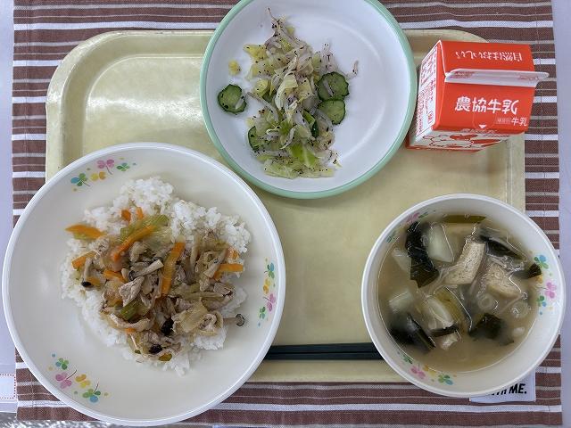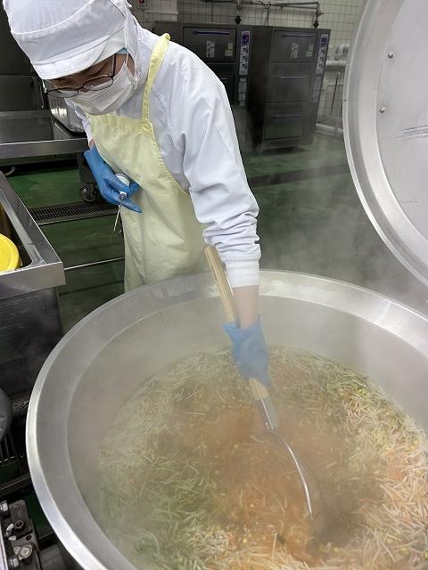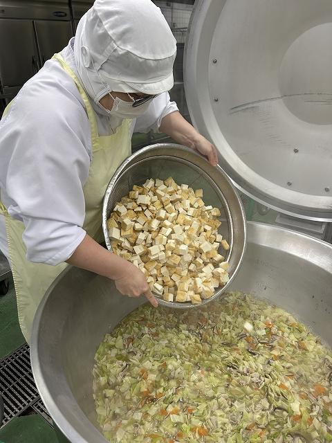また、汁物は「厚揚げの中華煮」です。いままでは冷凍の厚揚げを使っていましたが、今年度から町野の豆腐屋さんの厚揚げを使うことにしました。豆腐の味が濃く、とてもおいしく仕上がりました!