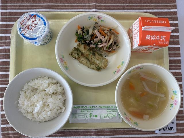 今日はの主菜は、「ちくわの磯辺揚げ」です。特に珍しいメニューではありませんが、給食では人気があります。調理員さんが1本1本1/4にカットして、衣をつけて揚げています。手作りのものはやっぱりおいしいですね!