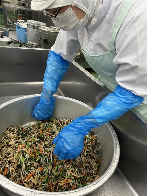 拌が和える、三は3種類、絲は細切りのことを意味します。春雨に合わせ、きゅうりもにんじんもせん切りにしました。給食では、衛生的に調理するため、和え物の野菜もすべて加熱調理しています。