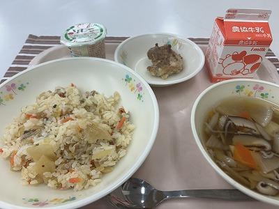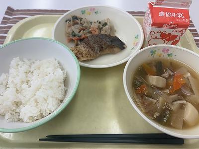 キムタクごはんは、6年生の家庭科で小路先生が考えたメニューです。それに合わせて、今日は長野県メニューにしました。キムタクごはんは、塩尻市の学校給食から誕生したもので、今では全国各地で愛されているメニューです。山賊焼きは、鶏肉をにんにくの効いたタレに漬け込み1枚をそのまま揚げた料理です。山賊というお店が発祥だそうです。