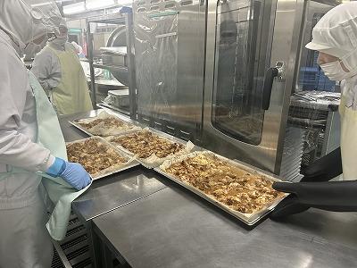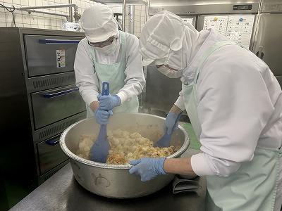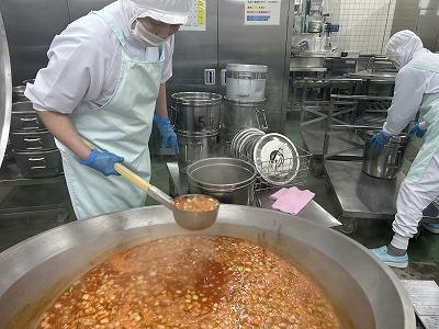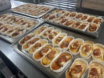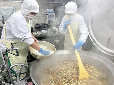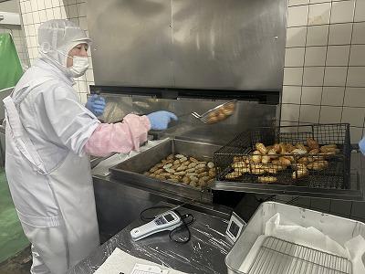 今日はみんなが大好きな「きなこ揚げパン」です。穴水町は冷凍のパンを使っているので、1つ1つ袋をあけています。高温でサッと揚げて、きなこと砂糖、塩を合わせたものをまぶします。350個のパンを手順よく作業しています。忙しい日になりましたが、子どもたちの喜ぶ顔を思い浮かべて作業してくれています!