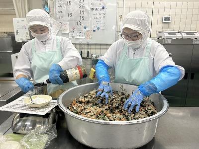 和え物には、石川県産のれんこんを使いました。いちょうぎりにしたれんこんに下味をつけてからあえています。