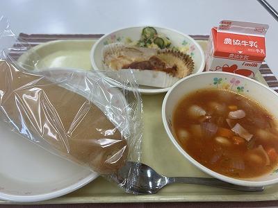 スープはミネストローネです。石川県産の大豆やじゃがいも、セロリ、にんじん、ベーコンなど角切りにした野菜がゴロゴロ入っています。