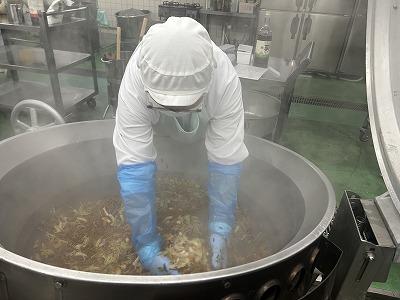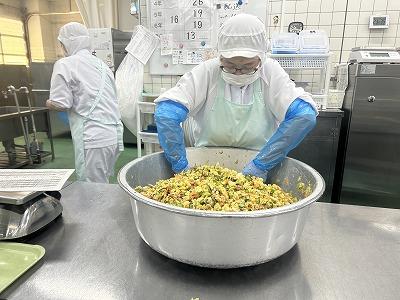 今日の給食は、「ひなまつり」の行事食です。給食では、ちらしずしとひなあられをつけました。ちらしずしは、大きな釜でと鶏肉やしいたけ、油揚げなどを味付けします。酢飯を作ってから具を混ぜ、仕上げに錦糸卵を混ぜています。錦糸卵をあとから加えるのは崩れるのを防ぐためです。