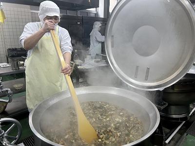 今日の給食は中華料理です。みそラーメンはスープから調理場の手作りです。キャベツやにんじん、たまねぎ、コーン、たけのこ、豚肉など具がたっぷりです。中華麺は別の釜でゆで、均等にクラスにあたるように量を計って食缶に入れています。調理場の中はラーメン屋さんのような香りに包まれていました(^^)