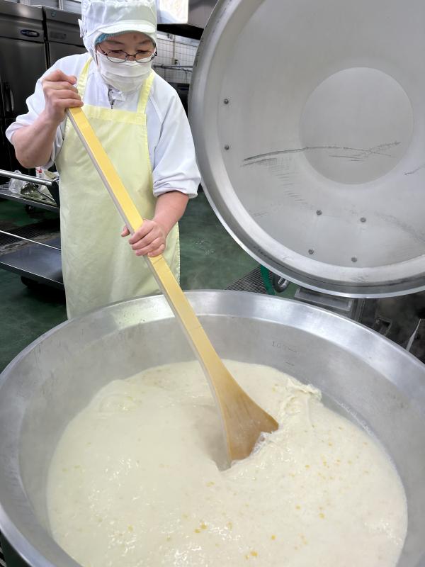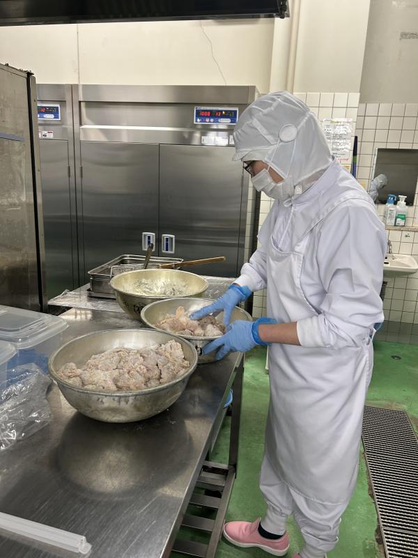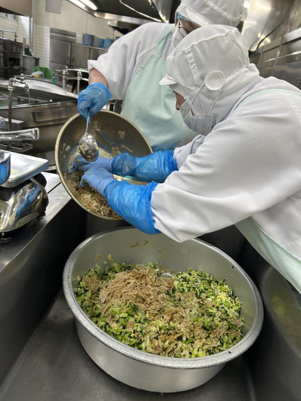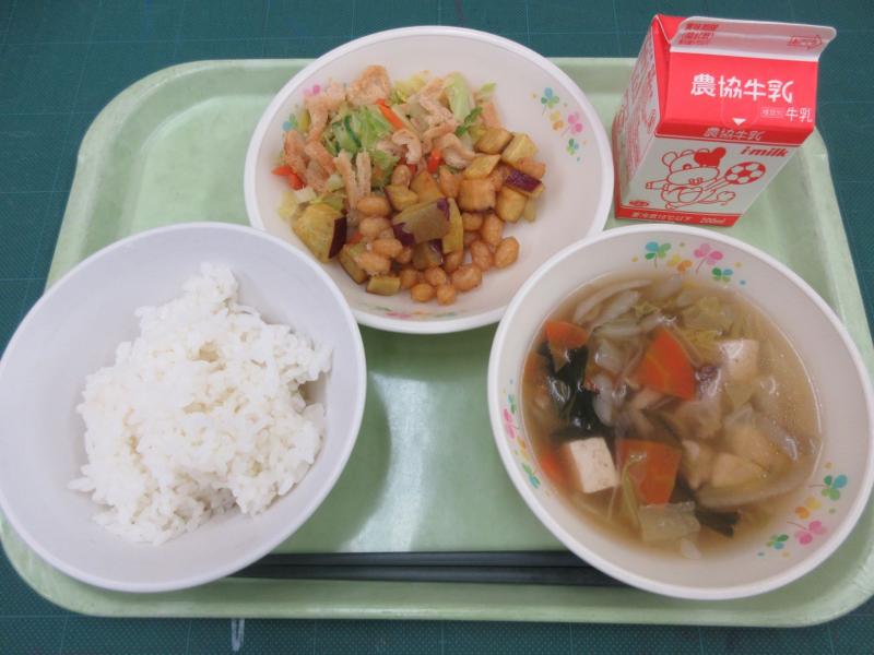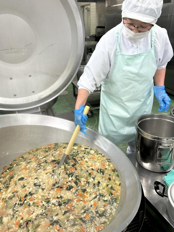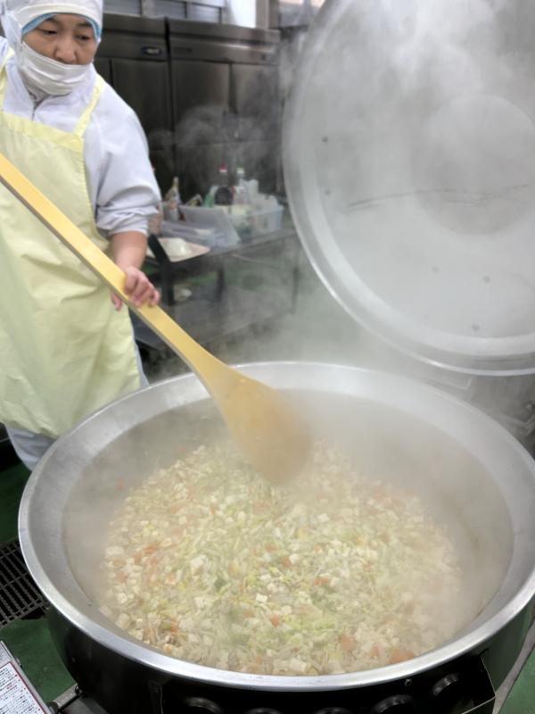 また、汁物は「とり野菜」です。なべの素にもありますが、給食では、みそに豆板醤や砂糖、にんにく、しょうがを入れ手作りしています。ごはんが進む味に仕上がりました。