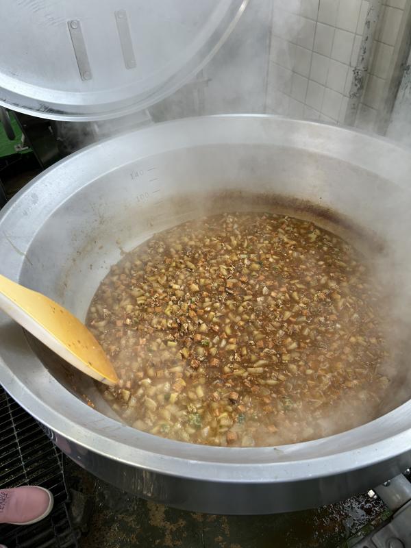 今日の汁物は、「麻婆大根」です。お野菜名人の大隅さんから、今年度最後のおでん大根を寄付していただき、